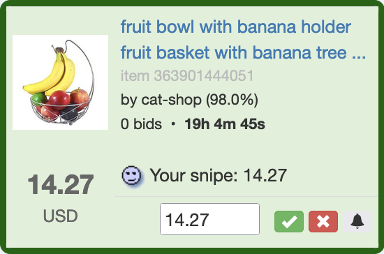 There are several ways to add a snipe. A snipe requires two things: An item number and a bid amount. Here are different ways to retrieve the item number.